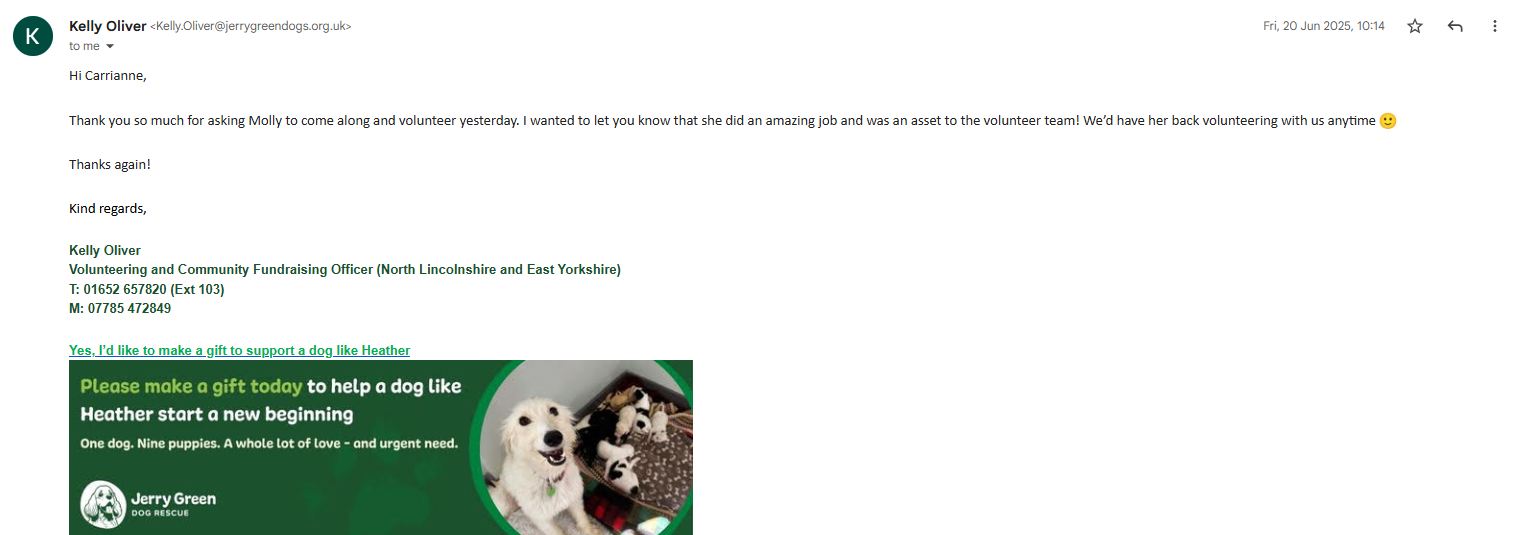 Thanks to the combined total of funds raised and volunteer support, Jerry Green Dog Rescue was able to vaccinate 22 dogs. These vaccinations are essential for protecting the dogs’ health and improving their chances of finding safe, loving forever homes.