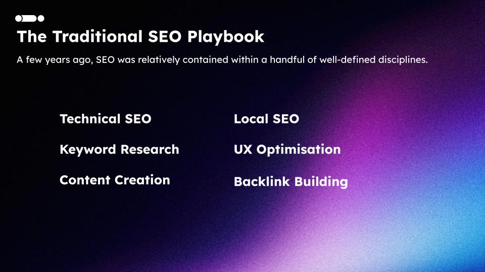 A few years ago, SEO was relatively contained within a handful of well defined disciplines: technical SEO, keyword research, content creation, local SEO, UX optimisation, and backlink building. These disciplines worked. Brands could rank, traffic would follow, conversions would happen. The system was predictable.